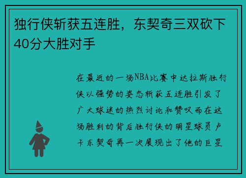 独行侠斩获五连胜,东契奇三双砍下40分大胜对手
