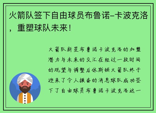 火箭队签下自由球员布鲁诺-卡波克洛,重塑球队未来!